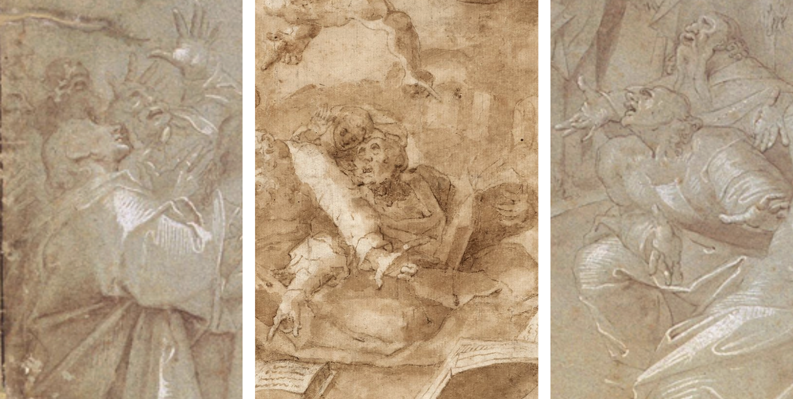 By comparing the two drawings, we can clearly attribute our sheet to Fernão Gomes, since their stylistic characteristics are so similar. Of particular note are the highly stylised faces (ill. 2), with exaggeratedly elongated limbs and outré poses and attitudes, and the excessively muscular and deformed hands, with the thumb and little finger spread impossibly far apart. It is also worth noting that the figure of the apostle raising his arm (on the right of the image on the left of ill. 2) is the same as that of the doctor pointing to a Bible (central image of ill. 2).
